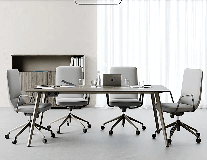 Bu toplantı masasının en önemli özelliği zarif alüminyum kenarıdır.